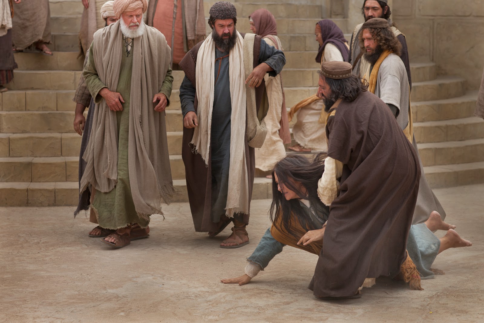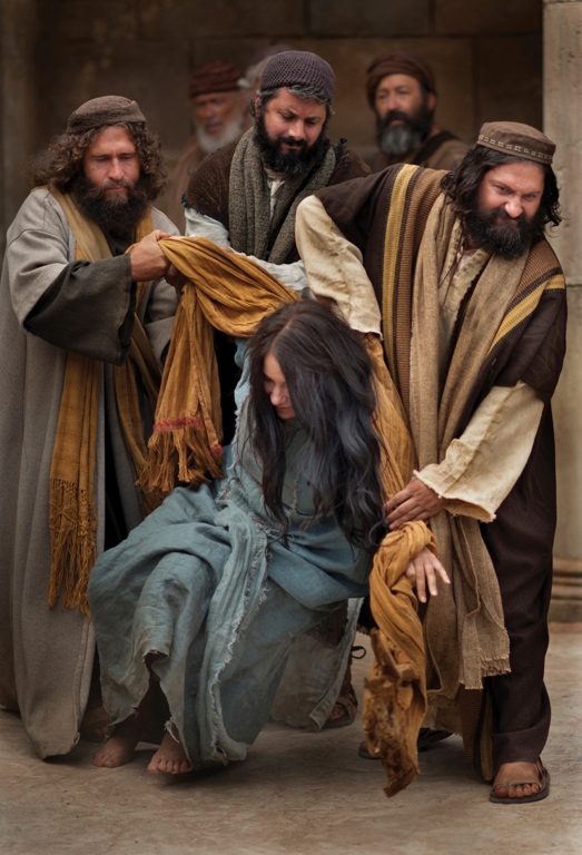 “于是各人都回家去了。耶稣却往橄榄山去。清早又回到殿里。众百姓都到祂那里去,祂就坐下教训他们。文士和法利赛人,带着一个行淫时被拿的妇人来,叫她站在当中。就对耶稣说,‘夫子,这妇人是正行淫之时被拿的。摩西在律法上吩咐我们,把这样的妇人用石头打死。你说该把她怎么样呢?’”(约8:1-5)
