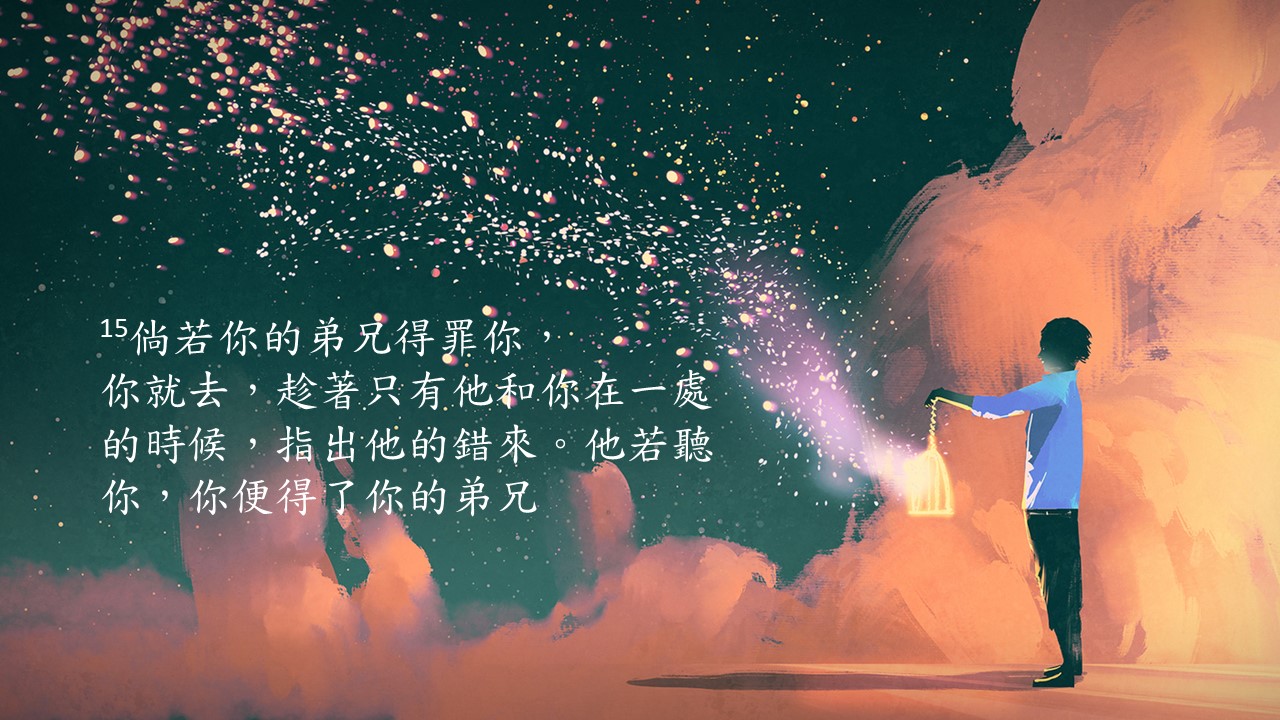“倘若你的弟兄得罪你,你就去,趁着只有他和你在一处的时候,指出他的错来。他若听你,你便得了你的弟兄;他若不听,你就另外带一两个人同去,要凭两三个人的口作见证,句句都可定准。若是不听他们,就告诉教会;若是不听教会,就看他像外邦人和税吏一样。”(太18:15-17)