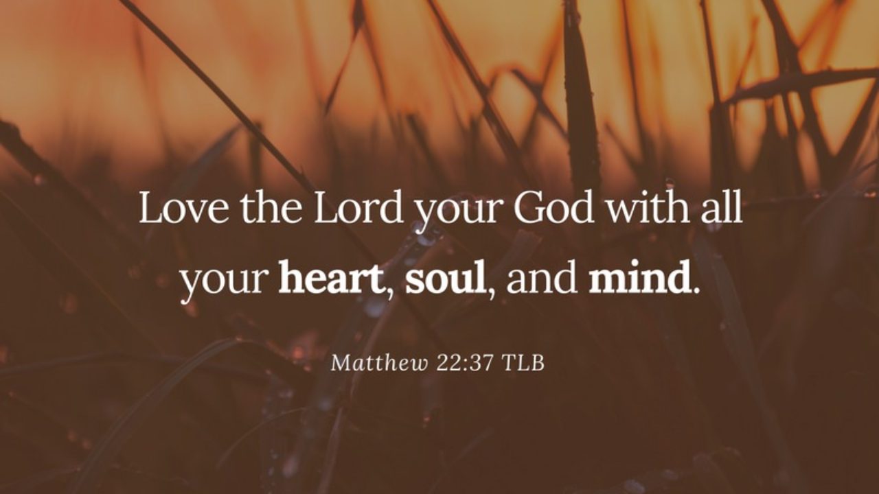 “耶稣对他说:你要尽心、尽性、尽意爱主─你的神。这是诫命中的第一,且是最大的。其次也相仿,就是要爱人如己。这两条诫命是律法和先知一切道理的总纲。”(太22:37-40)