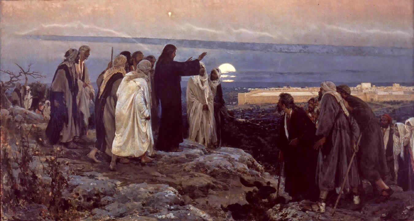 “耶稣出了圣殿,正走的时候,门徒进前来,把殿宇指给祂看。耶稣对他们说:你们不是看见这殿宇吗?我实在告诉你们,将来在这里没有一块石头留在石头上,不被拆毁了。耶稣在橄榄山上坐着,门徒暗暗的来说:请告诉我们,什么时候有这些事?你降临和世界的末了有什么预兆呢?”(24:1-3)