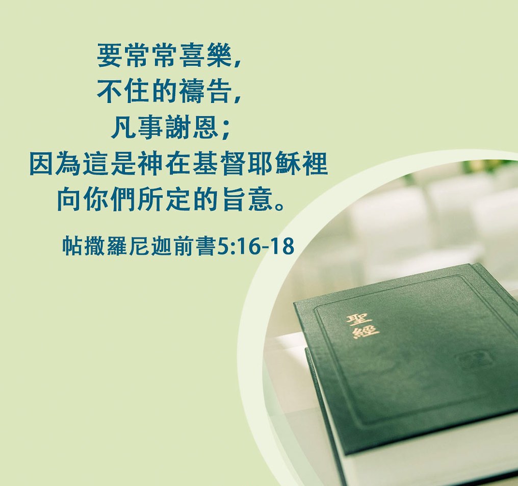 “要常常喜乐,不住地祷告,凡事谢恩。因为这是神在基督耶稣里向你们所定的旨意。”(帖前5:16-18)
