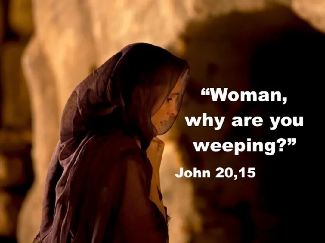 天使的问题似乎是明知故问,人在亲人的坟墓面前哭泣岂不是理所应当的吗?更何况,马利亚的哭泣,除了主耶稣的死之外还有一层,现今祂的身体好像又被人偷去了。