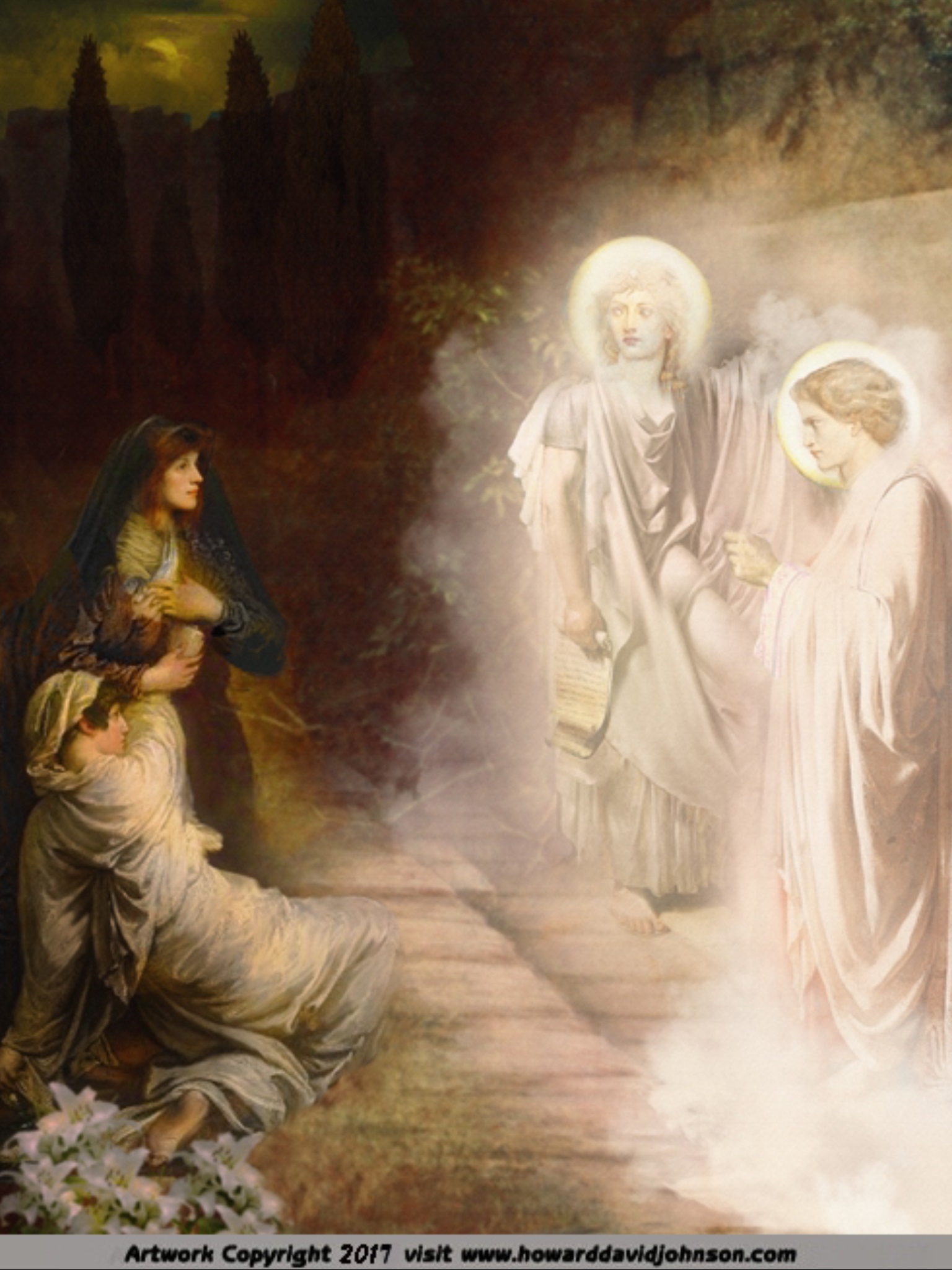 马利亚站在坟墓外面哭的时候,又低头往坟墓里看,期望耶稣的身体能够重新出现在那里。然而她却看见两个身穿白衣的天使。通常情况下,人看见天使会惊慌惧怕,但马利亚心中充满极度的忧伤,她甚至看见天使也顾不上害怕和惊慌。