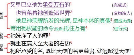这七项对神儿子的描述。分成创造、救赎与掌权三个部分。前四项是第一部分:神儿子的权柄、能力和展现,图中所列紫色的字是过去完成式,在永恒里神借着神的儿子,已经完成创造宇宙万物以及照着神的样式造人,神也已经立神的儿子为承受万有的,也就是已经把万有交给祂来掌管。