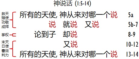 这七段旧约经文,七个“神说”以交叉对称的方式组成论证,第5节以“所有的天使,神从来对哪一个说”这句话做为开始,第13节以同样一句话“所有的天使,神从来对哪一个说”做为结束,把所有针对神儿子所讲的话包含在内。这些话神从来没有对任何一位天使说过,话中的对象也都不是天使,而是神的儿子。