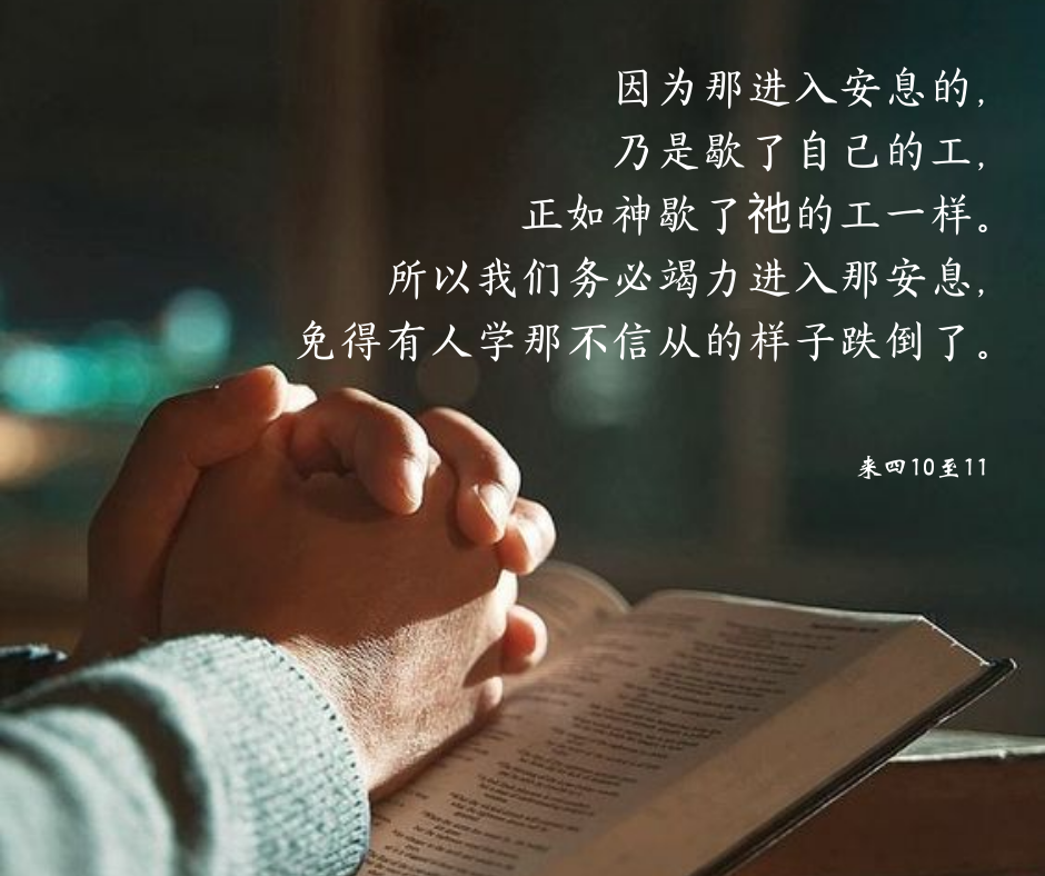 “若是约书亚已叫他们享了安息,后来神就不再提别的日子了。这样看来,必另有一安息日的安息为神的子民存留。因为那进入安息的,乃是歇了自己的工,正如神歇了祂的工一样。所以,我们务必竭力进入那安息,免得有人学那不信从的样子跌倒了。”(4:8-11)