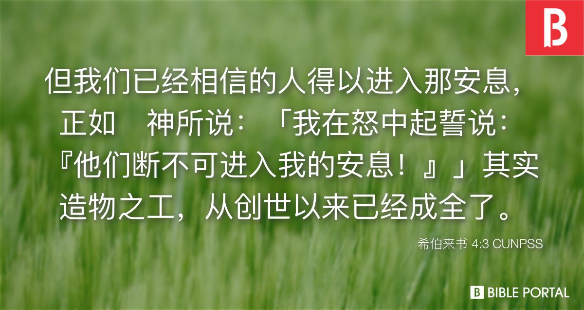 “其实造物之工,从创世以来已经成全了。论到第七日,有一处说,到第七日神就歇了祂一切的工。又有一处说:他们断不可进入我的安息!既有必进安息的人,那先前听见福音的,因为不信从,不得进去。”(4:3b-6)