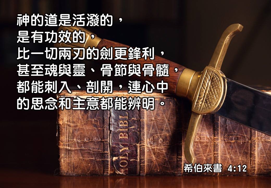 “神的道是活泼的,是有功效的,比一切两刃的剑更快,甚至魂与灵,骨节与骨髓,都能刺入、剖开,连心中的思念和主意都能辨明。并且被造的没有一样在祂面前不显然的;原来万物在那与我们有关系的主眼前,都是赤露敞开的。”(希伯来书4:12-13)