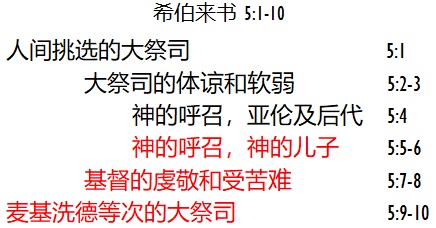 第五章1-10节也是用这样的架构来描述大祭司的资格和功能,并且引证基督不但完全符合大祭司的资格,并且被神照着麦基洗德的等次称为大祭司。