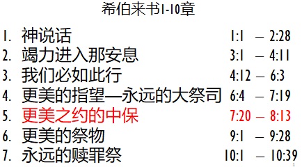 7:20-28就是第八、第九、第十,这三章经文的引言,第八章说明更美之约的由来,为何要取代旧约。第九章说明更美之约的中保大祭司,在天上真帐幕里所献的赎罪祭是什么。第十章宣告旧约献祭礼仪已经走入历史,说明更美之约中永远的赎罪祭之功效以及对我们的影响。现在我们来看7:20-28这个架构的内容。