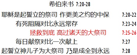 20-22节对称到28节都强调耶稣为祭司是神起誓立的,是更美的,是成全到永远的;23-24节及27节各有一个对比,“死亡阻隔和永远长存的对比”;“每日献祭和一次献祭的对比”,要说明律法所立人间大祭司和永远大祭司的差别;凸显出中间25-26节的中心信息,讲到这位高过诸天的大祭司,更美之约的中保要如何拯救我们这些罪人,让我们可以进到神的面前。