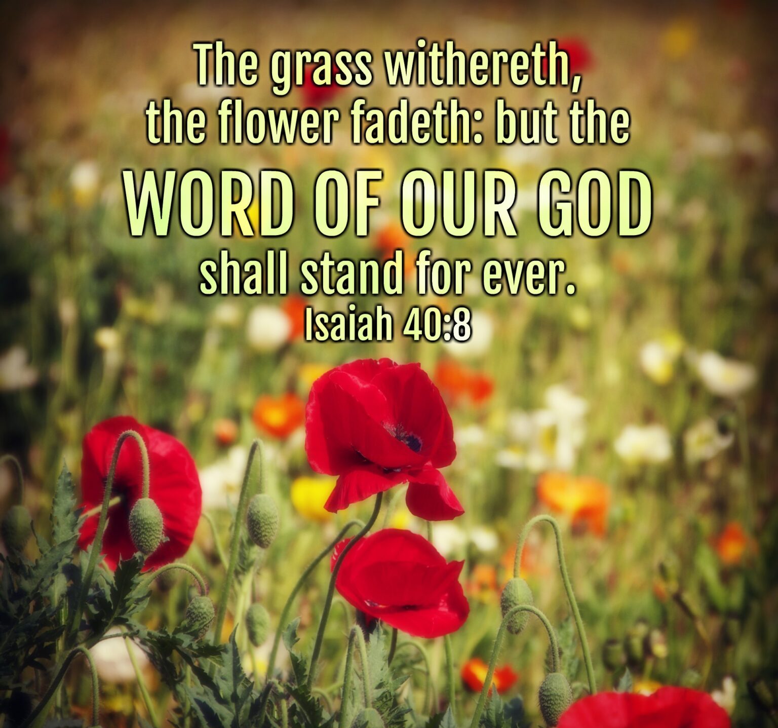 有人声说,“你喊叫吧!”有一个说,“我喊叫什么呢?”凡有血气的尽都如草,他的美容都像野地的花。草必枯干,花必雕残,因为耶和华的气吹在其上;百姓诚然是草。草必枯干,花必雕残。唯有我们神的话必永远立定。(赛四十6-8)