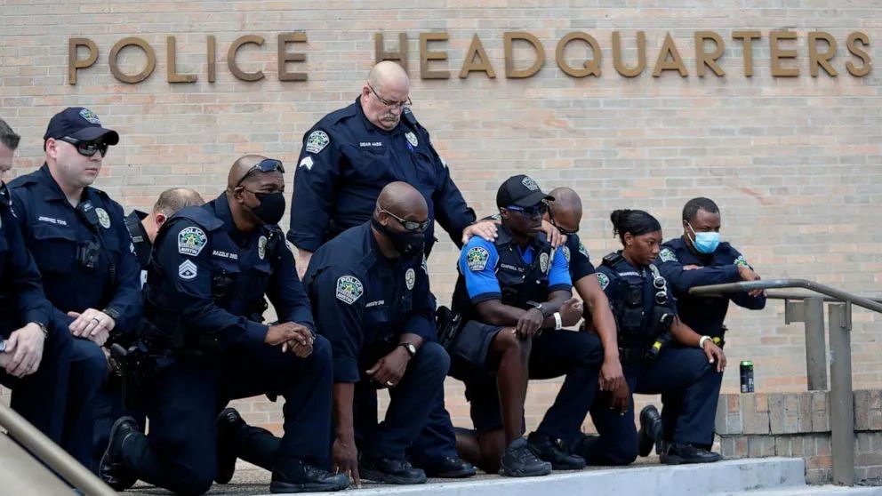 新闻图片:6月6日奥斯汀警察面对抗议者下跪