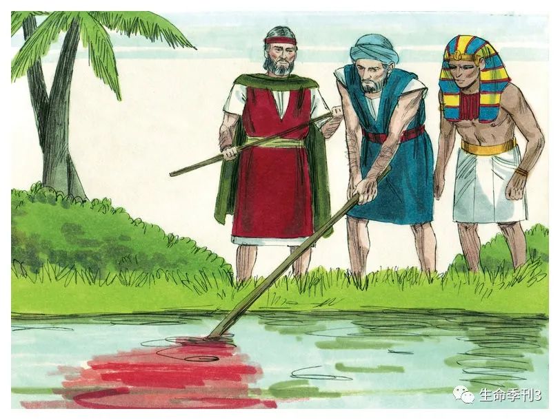 “耶和华对摩西说:法老心里固执,不肯容百姓去。明日早晨,他出来往水边去,你要往河边迎接他,手里要拿着那变过蛇的杖,对他说:耶和华─希伯来人的神打发我来见你,说:容我的百姓去,好在旷野事奉我。到如今你还是不听。耶和华这样说:我要用我手里的杖击打河中的水,水就变作血;因此,你必知道我是耶和华。河里的鱼必死,河也要腥臭,埃及人就要厌恶吃这河里的水。”(出埃及记7:14-18)