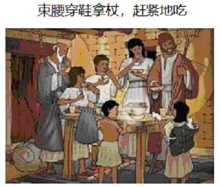 “你们吃羊羔当腰间束带,脚上穿鞋,手中拿杖,赶紧地吃;这是耶和华的逾越节。因为那夜我要巡行埃及地,把埃及地一切头生的,无论是人是牲畜,都击杀了,又要败坏埃及一切的神。我是耶和华。”(12:11-12)