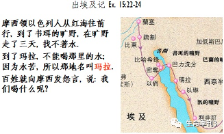 百姓从巴力洗分出发,走在书珥的旷野之中,因为是沙漠地区,基本没有淡水。他们走了三天找水,好不容易找到了水,他们又抱怨那里的水是苦的,那个地方就因为水是苦的所以叫做玛拉。什么是苦水?苦的水就不能喝吗?