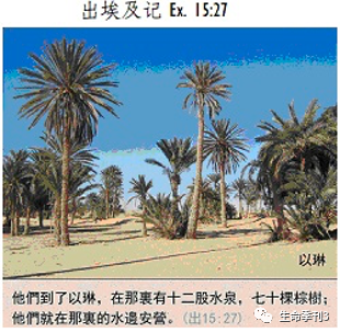 经过了玛拉的苦与甜,神的帮助和教导,百姓的光景好像好了一些,他们继续往南来到一个绿洲,叫做以琳,以琳就是棕树的意思,因为在那里有七十棵棕树,还有十二股水泉,非常好的一个绿洲。从逾越节开始他们一直在赶路,没有好好安营过;现在到了以琳,有足够的水源和腹地让他们停下休息,摩西就决定在以琳的水边安营。
