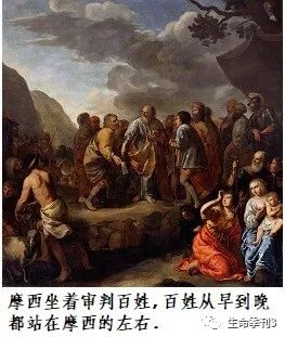 “第二天,摩西坐着审判百姓,百姓从早到晚都站在摩西的左右。摩西的岳父看见他向百姓所做的一切事,就说:你向百姓做的是什么事呢?你为什么独自坐着,众百姓从早到晚都站在你的左右呢?摩西对岳父说:这是因百姓到我这里来求问神。他们有事的时候就到我这里来,我便在两造之间施行审判;我又叫他们知道神的律例和法度。”(18:13-16)