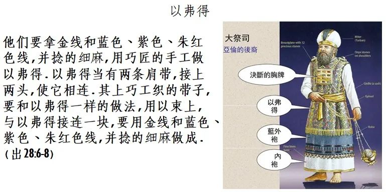 圣衣从以弗得的设计开始。以弗得有两根肩带还有腰带,是祭司穿在最外层的衣服。以弗得用的材料花色都很讲究,有金线、还有紫色朱红色的线,加上细麻的布料,是由手巧的师傅手工缝制出来的。肩带和腰带用的材料花色布料和以弗得是一致的,由巧工织成,可以固定以弗得。