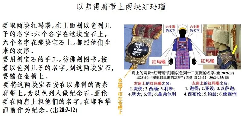 以色列百姓照着神的吩咐心甘情愿奉献了很多宝石,这些宝石都是出埃及的时候带出来的,摩西要从里面挑选出两块最好的红玛瑙,大小一致,上面要刻上以色列儿子的名字,每块各六个名字,要按照长幼顺序排列。这个时候神只有选出亚伦和他四个儿子是祭司,整个利未支派还没有被神分别出去成为祭司支派,所以红玛瑙上面的名字刻的应该是原来雅各的那十二个儿子,每边六个,按照出生顺序右边是流便、西缅、利未、犹大、但、拿弗他利,左边是迦得、亚设、以萨迦、西布伦、约瑟、便雅悯。