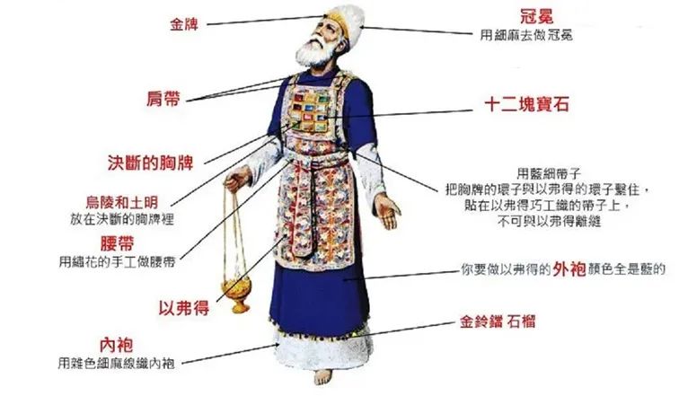 大家可以从这一张图来了解大祭司圣衣的整个设计和外观,从额头上的细麻冠冕和纯金金牌,到以弗得的红玛瑙肩带,肩带下面金炼连接决断的胸牌,胸牌上镶着十二块不同的宝石,胸牌夹层里面有乌陵和土明;胸牌下面金环用蓝色细带子绑住用绣花手工做的细麻腰带;胸牌是最外层,下一层就是以弗得背心裙,再里面一层就是纯蓝色的外袍,外袍底边有一圈蓝色紫色朱红色线做的石榴,石榴和石榴之间绑一个金铃当,整个外袍下摆一转都是这样的设计。外袍里面是杂色细麻织的内袍。这就是大祭司的装扮和配件。当他执行大祭司任务的时候就要穿上。