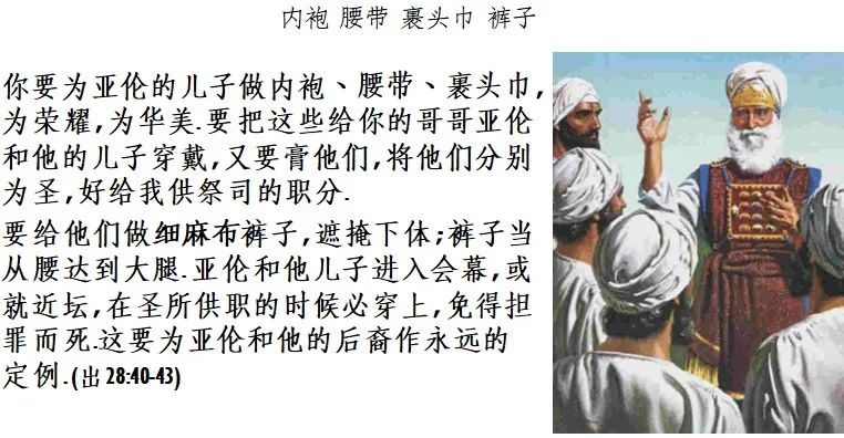 “你要为亚伦的儿子做内袍、腰带、裹头巾,为荣耀,为华美。要把这些给你的哥哥亚伦和他的儿子穿戴,又要膏他们,将他们分别为圣,好给我供祭司的职分。要给他们做细麻布裤子,遮掩下体;裤子当从腰达到大腿。亚伦和他儿子进入会幕,或就近坛,在圣所供职的时候必穿上,免得担罪而死。这要为亚伦和他的后裔作永远的定例。”(28:40-43)