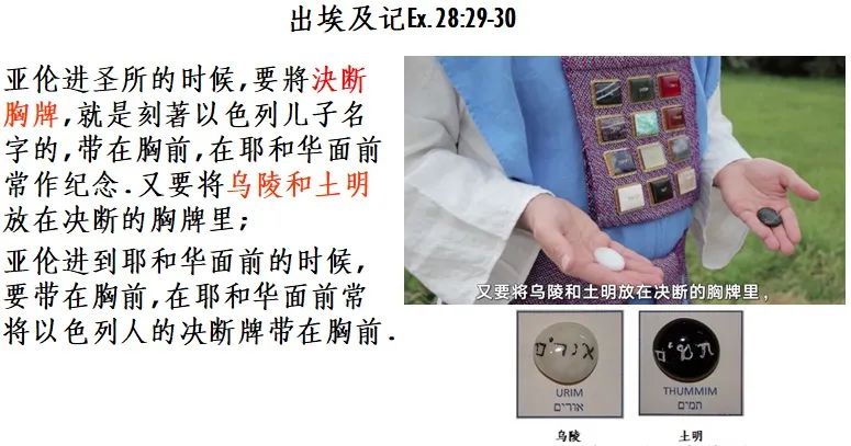 胸牌是两层细麻布做的,上边下边都缝合,两边开口,可以把东西放在夹层里面。大祭司进圣所的时候,穿戴着胸牌,一方面是纪念十二支派,另一方面他要把两块石头放在胸牌里面,一块叫做乌陵,另一块叫做土明。这是审判、问疑或决议时用来做决断的。