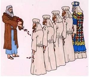 “要使亚伦和他儿子到会幕门口来,用水洗身。要给亚伦穿上内袍和以弗得的外袍,并以弗得,又带上胸牌,束上以弗得巧工织的带子。把冠冕戴在他头上,将圣冠加在冠冕上,就把膏油倒在他头上膏他。要叫他的儿子来,给他们穿上内袍。给亚伦和他儿子束上腰带,包上裹头巾,他们就凭永远的定例得了祭司的职任。又要将亚伦和他儿子分别为圣。”(出埃及记29:4-9)