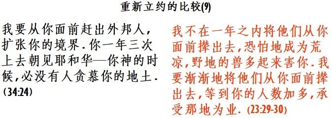 关于要承受的迦南产业,在这次立约中,特别说明神会把迦南地的外邦人赶出去,百姓一年三次守节期间,神会保守以色列人的产业,外邦人不敢趁机越界侵犯。而前一次立约23:29-30,神提到赶出外邦人的时间和原因,都是为了要让以色列百姓能顺利承受产业。所以这两段叙述虽然不太相同,但是神的用意和规划是一致的。