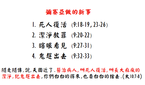 耶稣在众人面前行出来这四件神迹就是死人复活、洁净赦罪、瞎眼看见、鬼赶出去,要显明耶稣就是那位神所差派来的弥赛亚,要证明耶稣所传天国的福音。马太10:7-8耶稣差派十二使徒出去,给他们权柄,也可以行出这四件弥赛亚所做的新事。我们来看耶稣是怎么做的:
