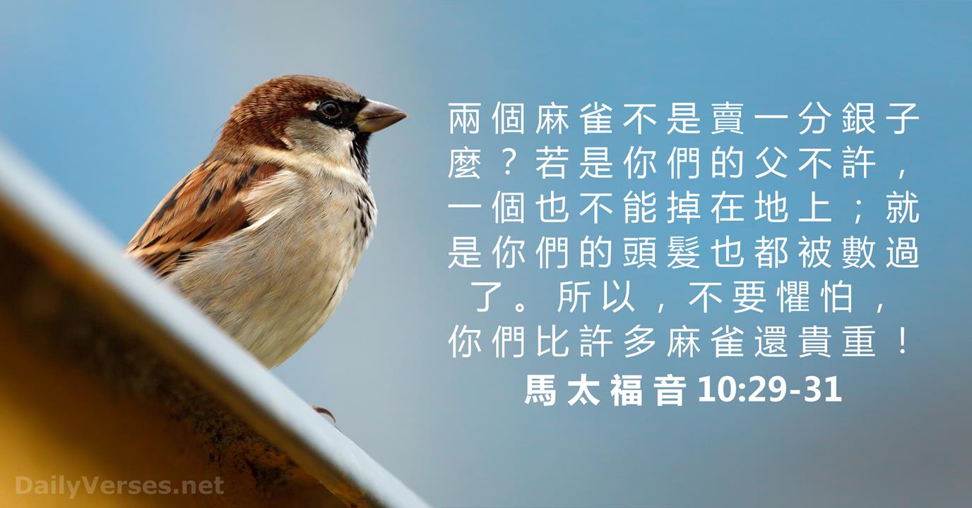 “那杀身体,不能杀灵魂的,不要怕他们;惟有能把身体和灵魂都灭在地狱里的,正要怕祂。两个麻雀不是卖一分银子吗?若是你们的父不许,一个也不能掉在地上;就是你们的头发也都被数过了。所以,不要惧怕,你们比许多麻雀还贵重!”(太10:28~31)